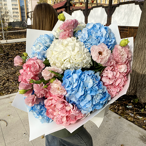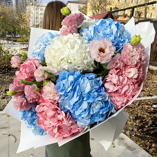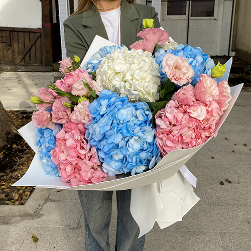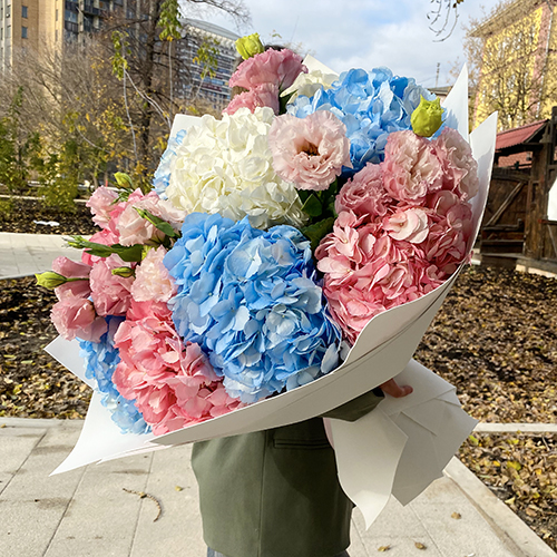 Букет-гигант из гортензий и эустом "Ванильное небо"