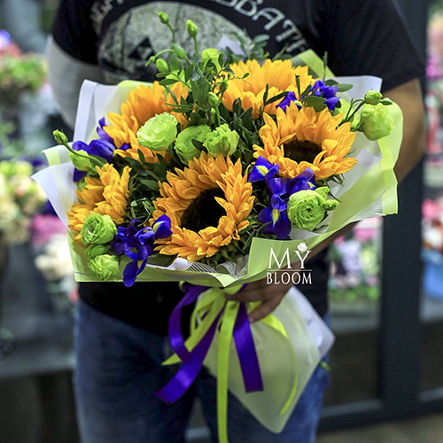 Букет из подсолнухов, ирисов и эустом