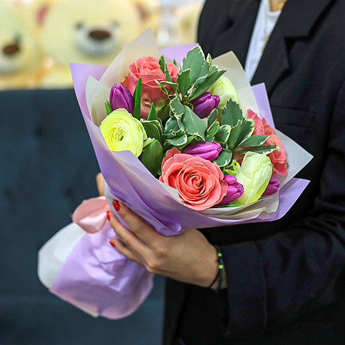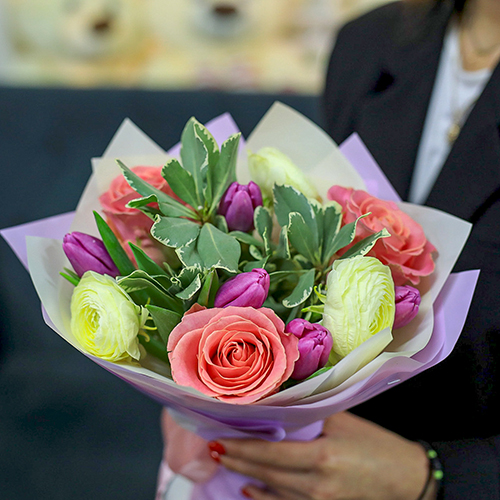 Букет с ранункулюсами, тюльпанами и розами