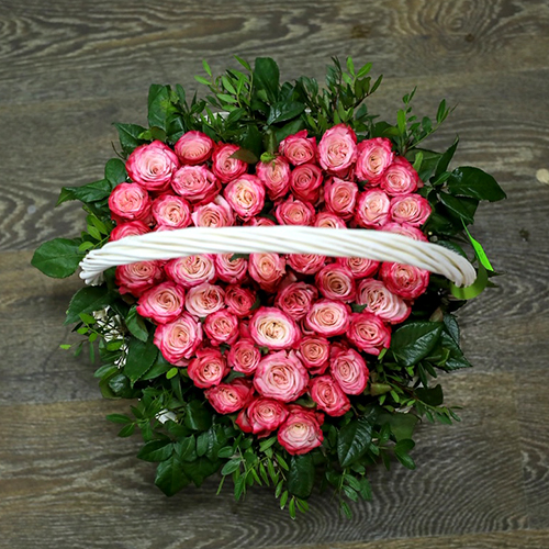 51 розовая роза в форме сердца в корзине (30 см)