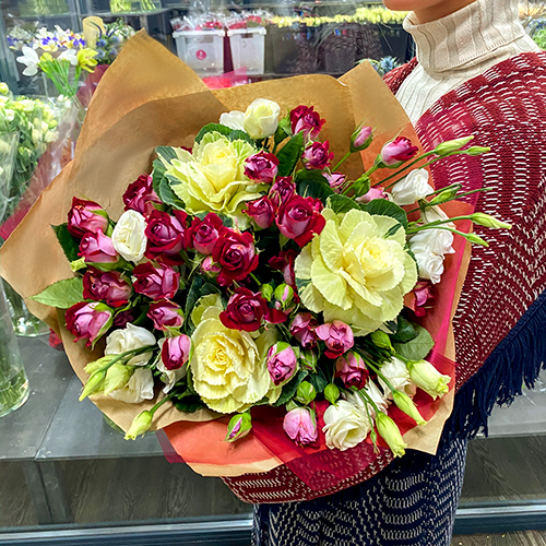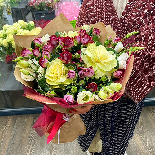 Микс красных кустовых роз, брассики и эустом
