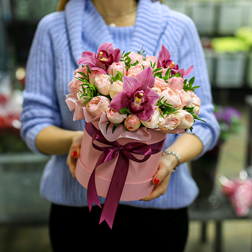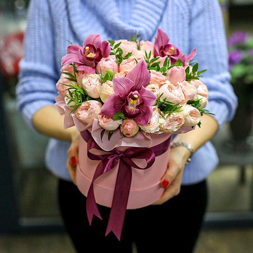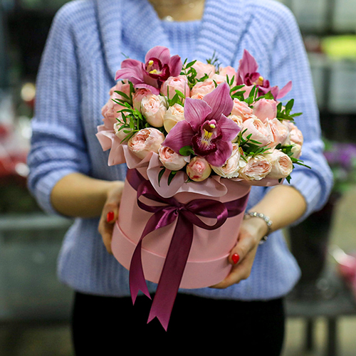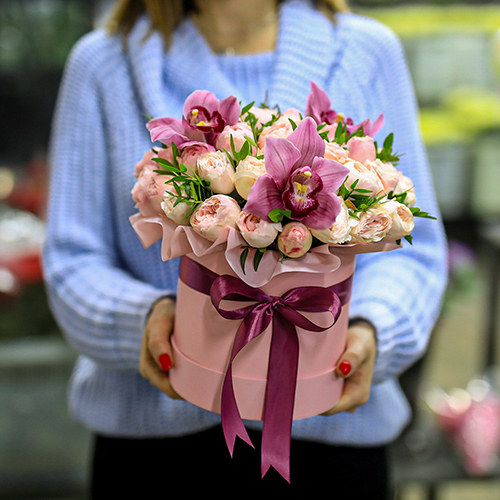 Пионовидные розы и орхидеи в шляпной коробке (22 см)
