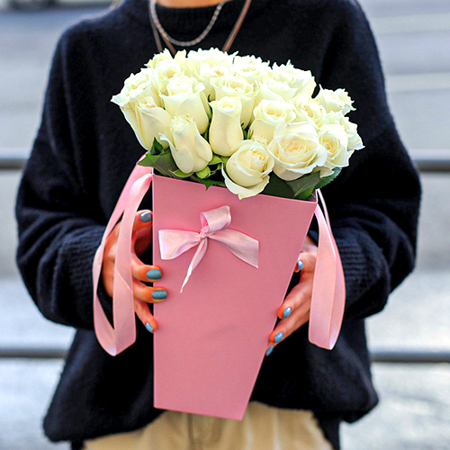 Букет 25 белых Кенийских роз в коробке трапеция (35 см)