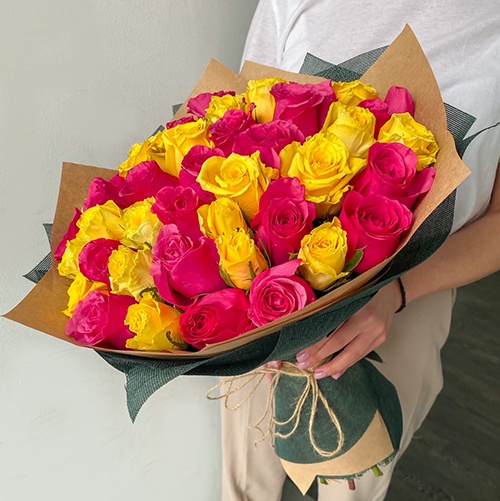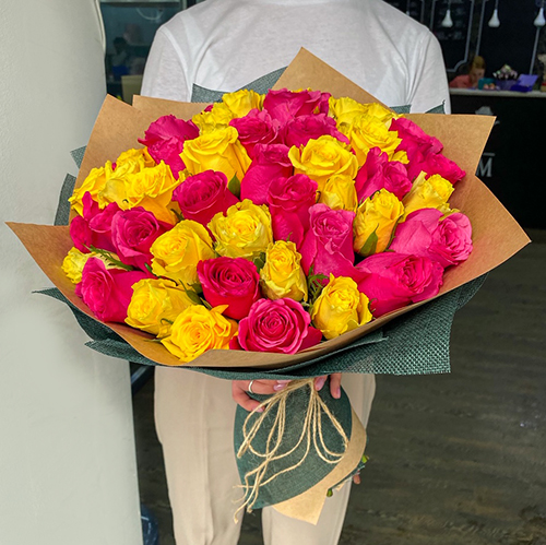 Букет 51 роза малиново желтый микс в кантри стиле (40 см)