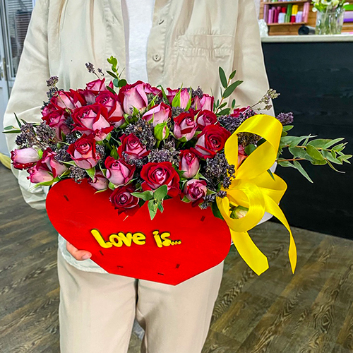 Красные кустовые розы в сердце Love is (25 см)