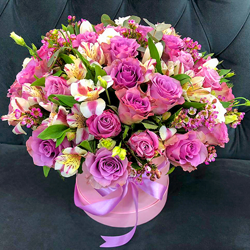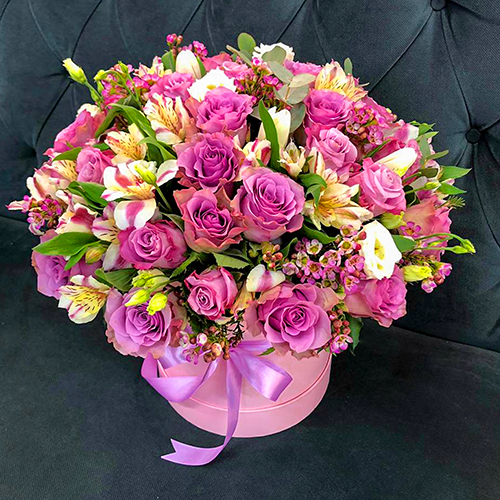 Роза в миксе с альстромерией и эустомой в шляпной коробке