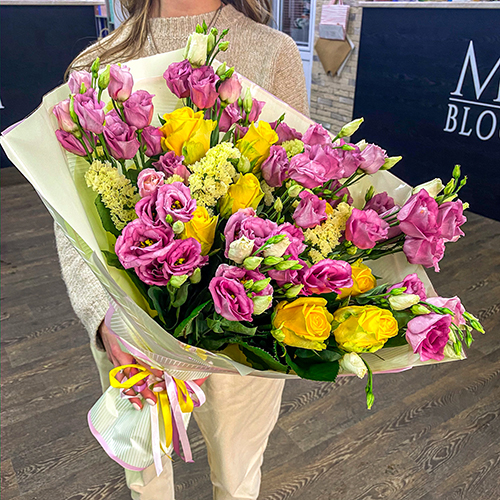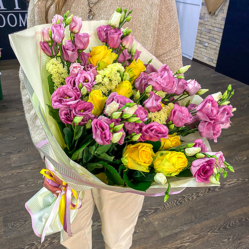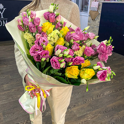 Микс желтых роз и розовых эустом (50 см)