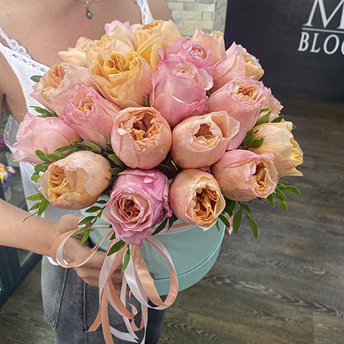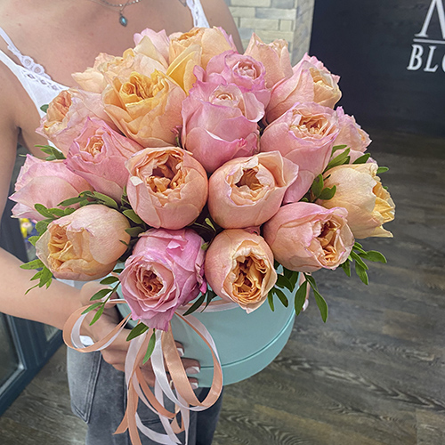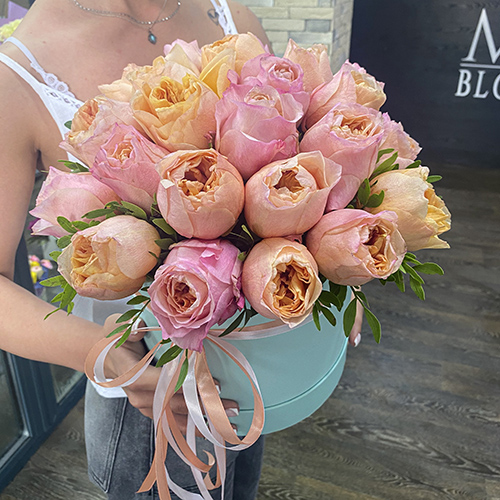 Пионовидные розы Джульетта в шляпной коробке (25 см)