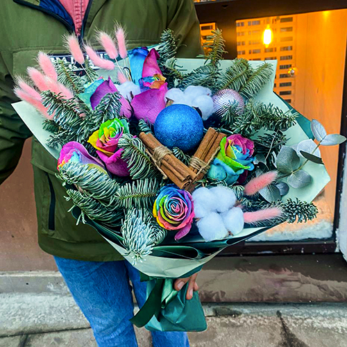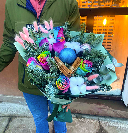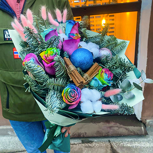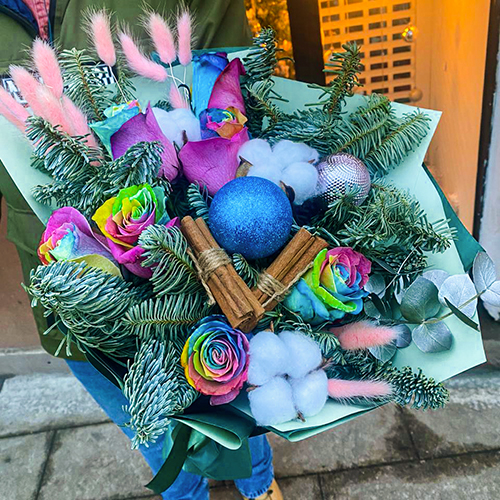 Букет из радужных роз Эквадор с лапником и корицей