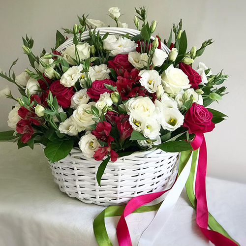 Корзина микс из роз, эустом и альстромерий