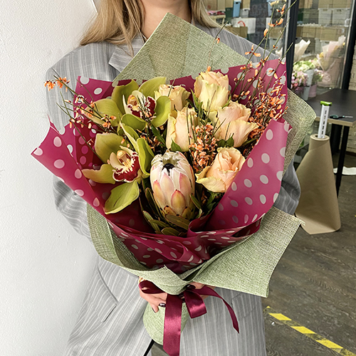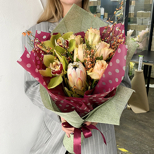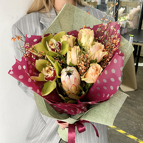 Букет с протеей, орхидеями, розой и генистой