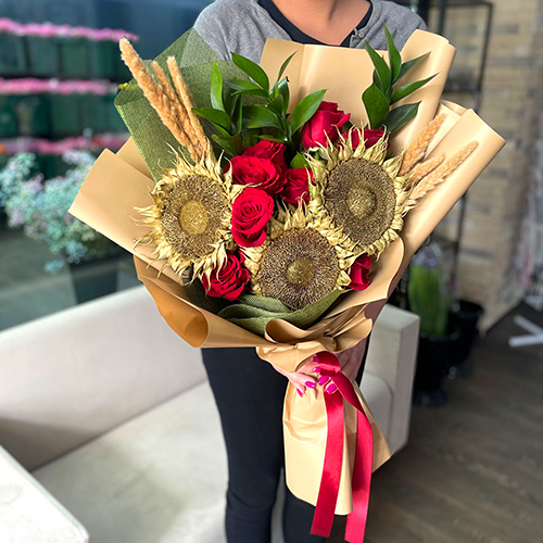 Букет из Рубиновых роз и золотых подсолнухов (50 см)