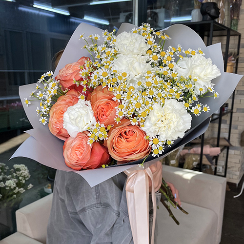 Букет из роз Эквадор с ромашками и диантусами