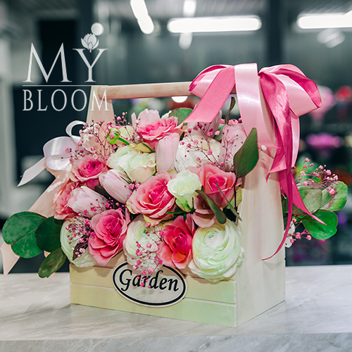 Нежный микс из роз, ранункулюсов и тюльпанов в деревянном ящике
