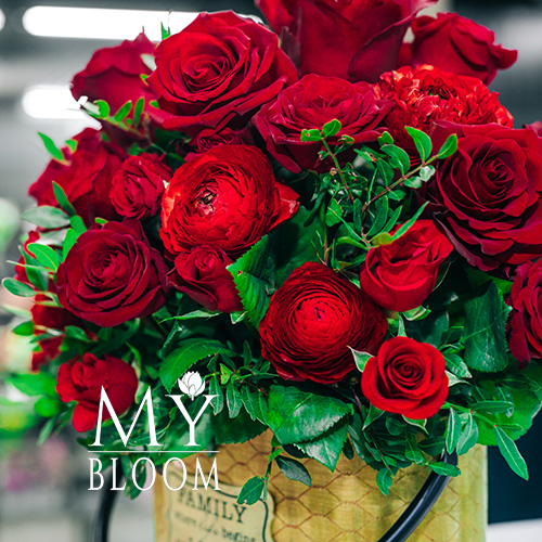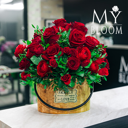 Розы и ранункулюсы в деревянном ящике (45 см)