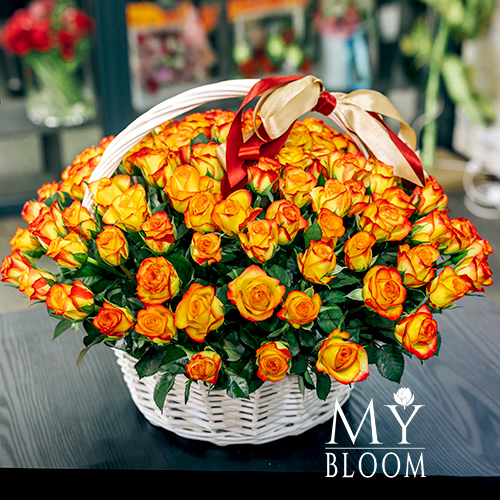 101 желто-красная роза в корзине (40 см)