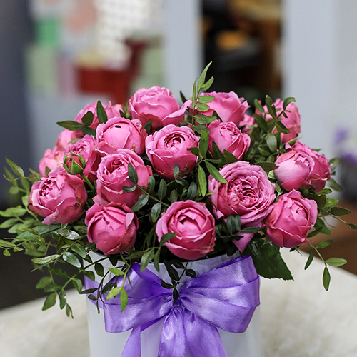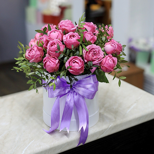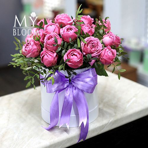 Пионовидные кустовые розы Мисти Баблс в шляпной коробке (30 см)