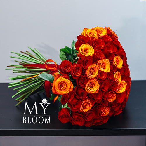 Букет 75 красных и оранжевых роз (70 см)