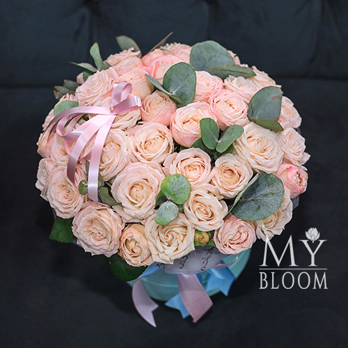 Нежные кустовые розы в шляпной коробке (28 см)