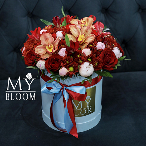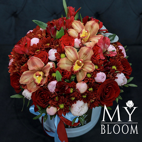 Шляпная коробка с ярким миксом из роз, орхидей и хризантемы