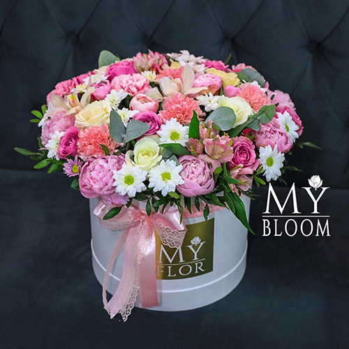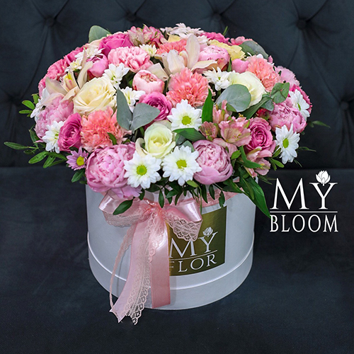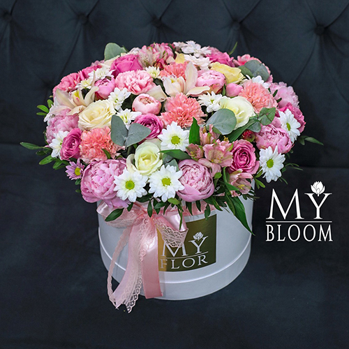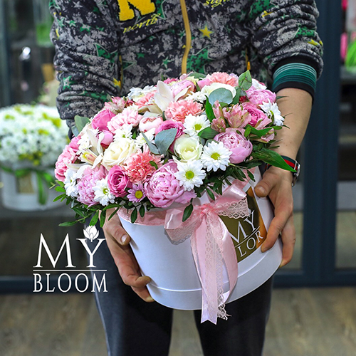 Микс из роз, пионов и хризантемы в шляпной коробке