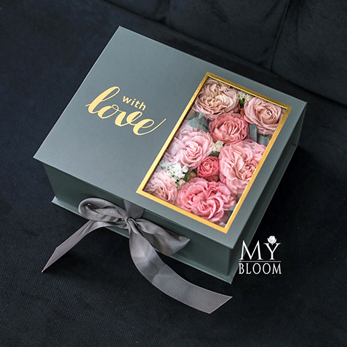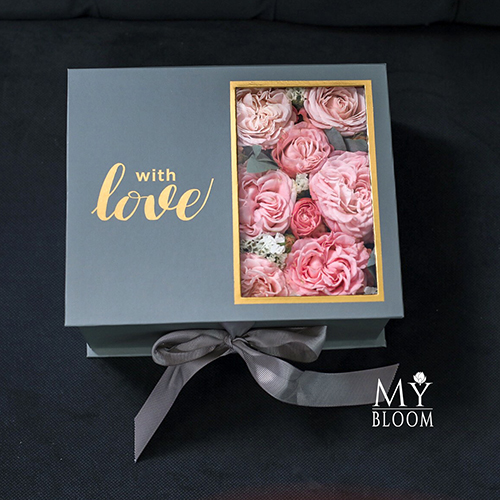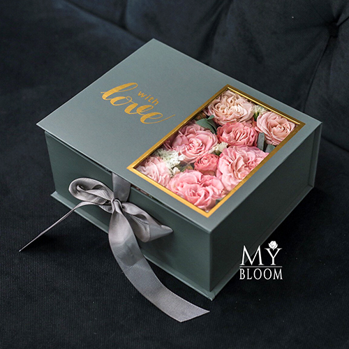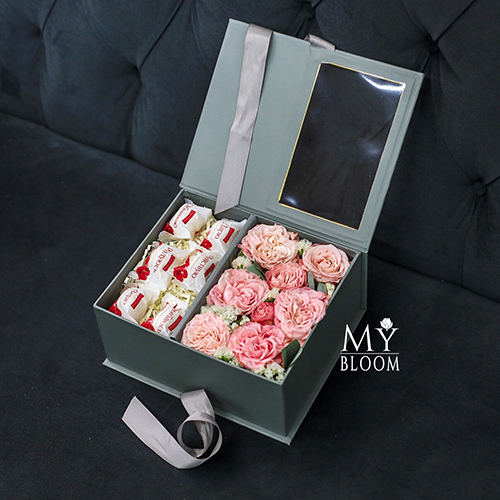 Кустовые пионовидные розы Бомбастик с Raffaello в подарочной коробке (10 х 20 см)