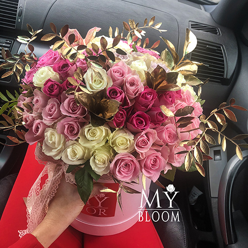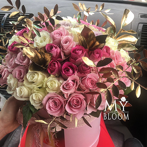 Большой розовый микс с золотыми ветками в шляпной коробке