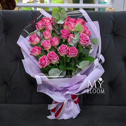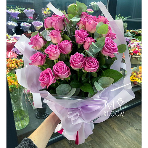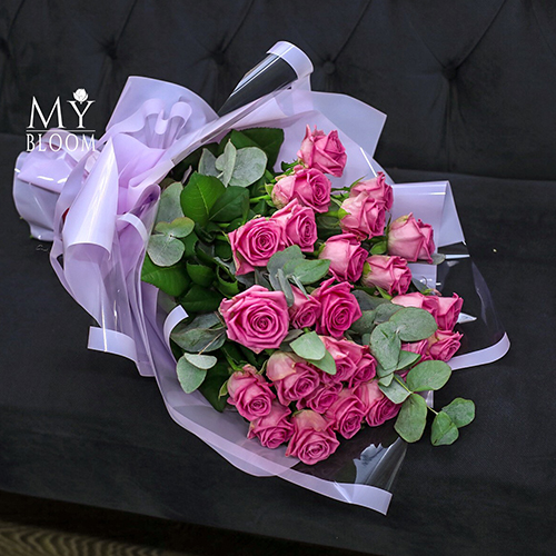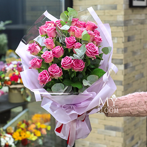 Букет 25 розовых роз с эвкалиптом (50 см)
