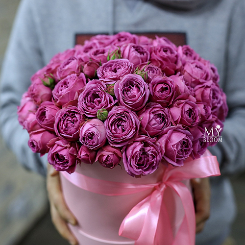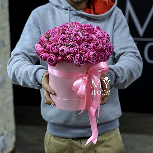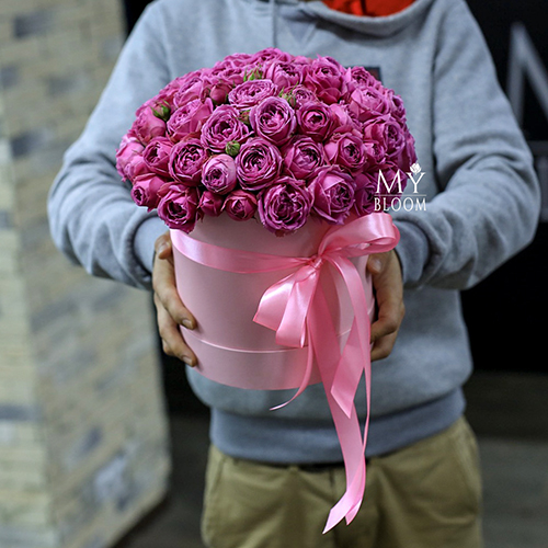 Шляпная коробка с кустовыми пионовидными розами мисти бабллс (30 см)