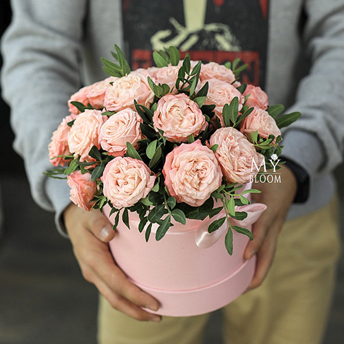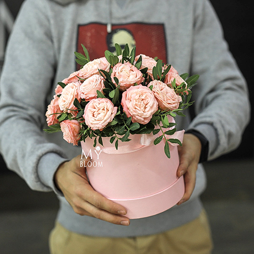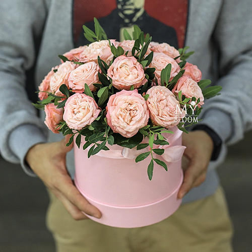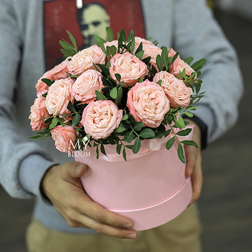 Шляпная коробками с кустовыми пионовидными розами Бомбастик (22 см)