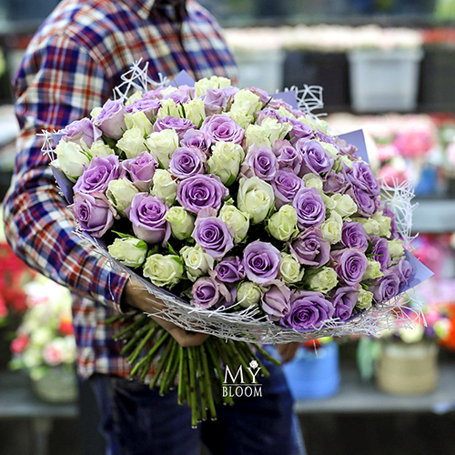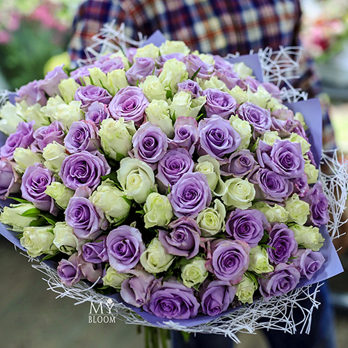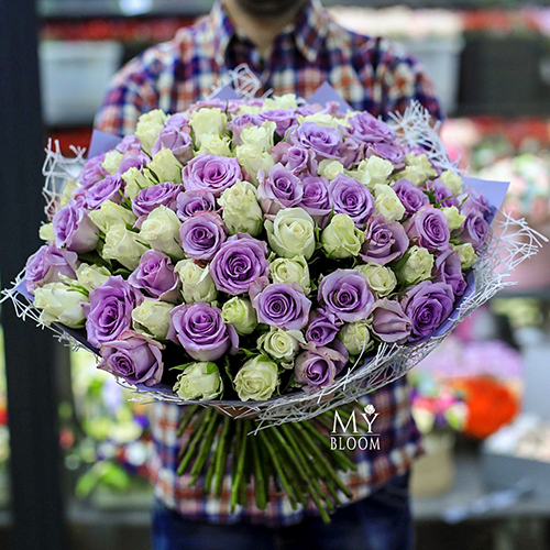 Букет 101 роза лиловая и белая микс (40 см)