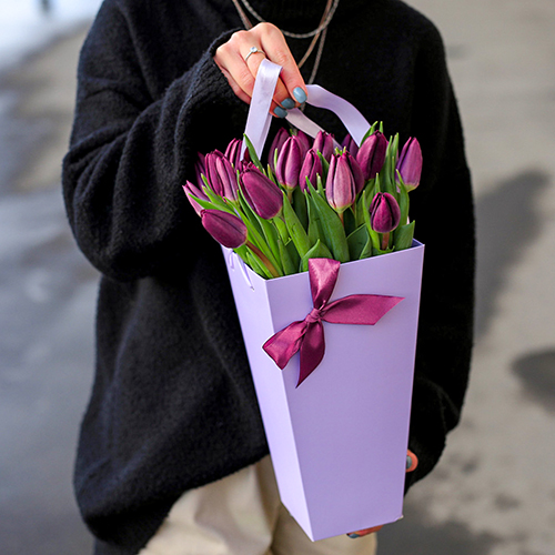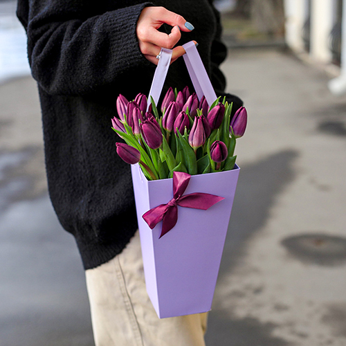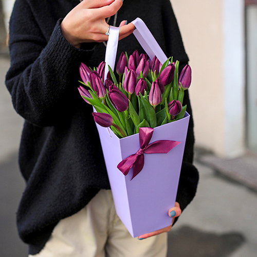 Букет 25 фиолетовых тюльпанов в коробке трапеция