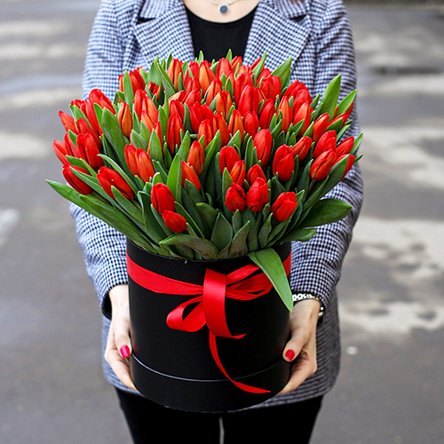 101 красный тюльпан в шляпной коробке