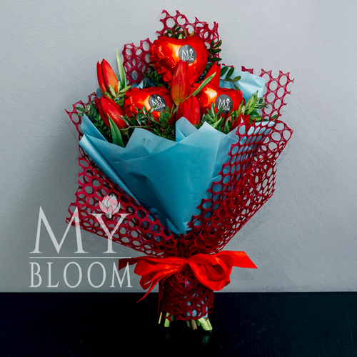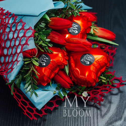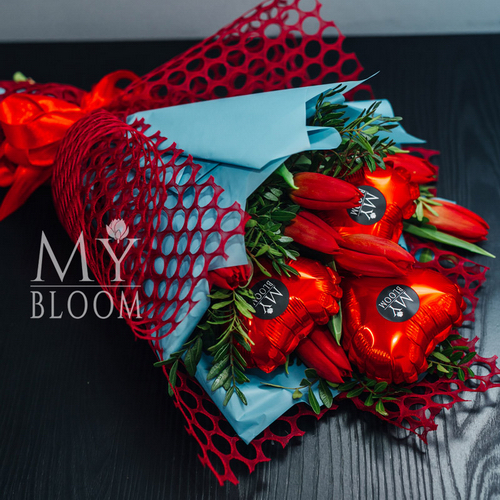 Букет из 7 красных тюльпанов с шариками